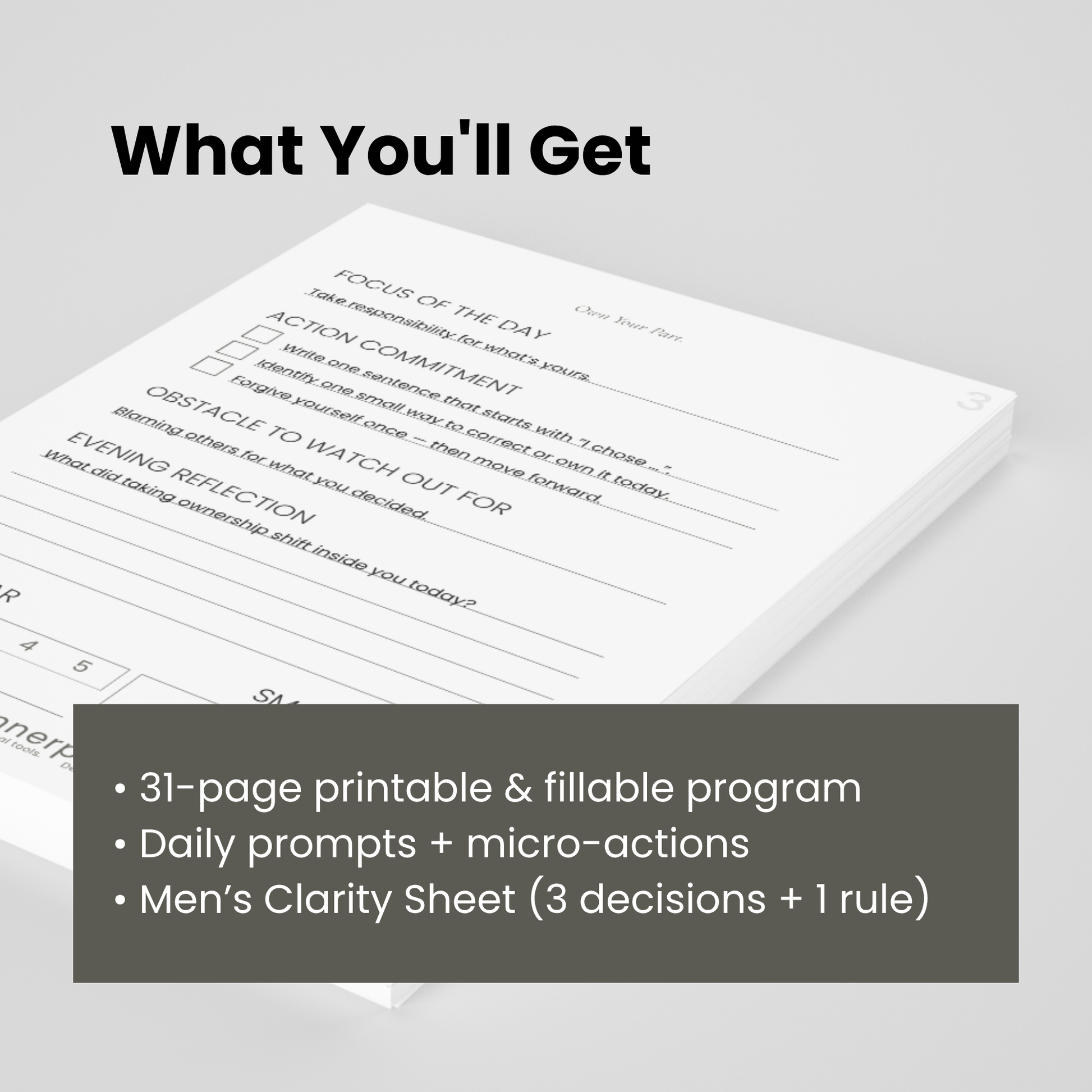 The 31-Day Men’s Clarity Program gives you one focused prompt and one action each day, helping you make three honest decisions by the end of the month.